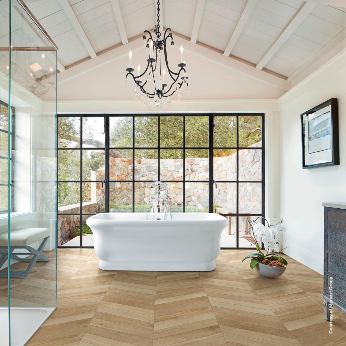 Colecția Treverksoul de la Marazzi este creată special pentru a aduce farmecul pardoselilor din vilele europene de epocă în contextul designului modern. Formatul Chevron de 11x54 cm, cu tăietură la unghi, facilitează un montaj spectaculos, transformând pardoseala într-un element central de decor.