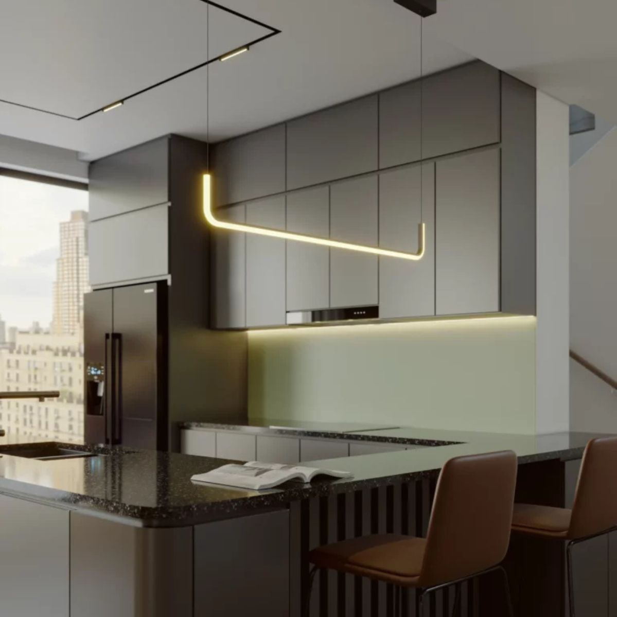 • Datorită formei sale alungite de 90 cm, acest pendul este partenerul ideal pentru suprafețele rectangulare. Suspendat prin două cabluri discrete, corpul metalic negru pare să plutească, oferind un iluminat direct, generos (1368 lumeni), fără a încărca vizual tavanul. Este soluția perfectă pentru a delimita zona de luat masa într-un open-space sau pentru a oferi o lumină de lucru optimă deasupra unui birou modern.